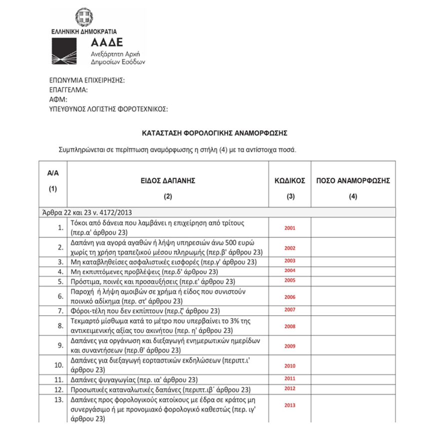 Αντίστοιχα στην Κατάσταση Φορολογικής Αναμόρφωσης , δηλαδή στο έντυπο που αναγράφονται όλες οι δαπάνες που δεν εκπίπτουν φορολογικά, υπάρχει ο κωδικός 2013 με την ένδειξη «Δαπάνες που καταβάλλονται σε κράτος μη συνεργάσιμο ή που υπόκειται σε προνομιακό φορολογικό καθεστώς»
