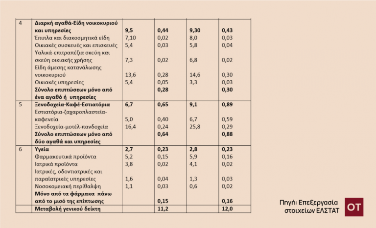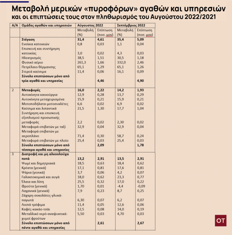 Πρώτον, δύο μόνο ομάδες αγαθών και υπηρεσιών «πυροδότησαν» τον πληθωρισμό, όπως και τον περασμένο Αύγουστο, κατά το μεγαλύτερο μέρος από την πρόσθετη επιβάρυνση κατά 0,80 ποσοστιαίες μονάδες. Πρόκειται για την ομάδα «Στέγαση», η οποία «προικοδότησε» τον πληθωρισμό με 0,48 της ποσοστιαίας μονάδας (οφείλεται σχεδόν εξολοκλήρου στην αύξηση του φυσικού αερίου!) από το συνολικό 0,80 της ποσοστιαίας μονάδας (σε σχέση με τον Αύγουστο) και την ομάδα «Ξενοδοχεία – Καφέ – Εστιατόρια», η οποία, παραδόξως, προικοδότησε κι αυτή με τη σειρά τον πληθωρισμό με 0,24 της ποσοστιαίες μονάδες. Δηλαδή, μόνο δύο ομάδες «μπούκωσαν» τον πληθωρισμό με επιπλέον 0,72 της ποσοστιαίες μονάδας ή κατά 90%!!! Σημειώνεται ότι όλη αυτή πρόσθετη επιβάρυνση οφείλεται, όπως και τον περασμένο Αύγουστο σε αυξήσεις τιμών στα εστιατόρια-ζαχαροπλαστεία -καφενεία και ξενοδοχεία – μοτέλ – πανδοχεία!