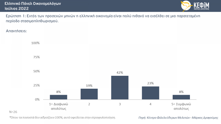 Στο «Ελληνικό Πάνελ Οικονομολόγων» για τον Ιούλιο που δημοσιεύει το ΚΕΦίΜ-απάντησαν συνολικά 26 Ελληνίδες και Ελληνες οικονομολόγοι- και το 27% θεωρεί μάλλον απίθανο έναν παρατεταμένο στασιμοπληθωρισμό στην Ελλάδα στη χώρα μας εντός των προσεχών μηνών, ενώ το 31% τον θεωρεί πιθανό. Οικονομολόγοι και κυβερνήσεις καταγράφουν την αβεβαιότητα που χαρακτηρίζει σήμερα το διεθνές περιβάλλον. Στη νέα πραγματικότητα, τα επιτόκια πρόκειται να αυξηθούν και στην Ελλάδα και είναι άγνωστη η πορεία των διεθνών τιμών στην ενέργεια.