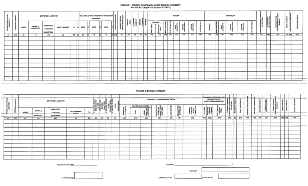 – στη στήλη 30 «ΤΟ ΑΚΙΝΗΤΟ ΕΙΝΑΙ ΗΛΕΚΤΡΟΔΟΤΟΥΜΕΝΟ» του Πίνακα 1 αναγράφεται η ένδειξη ΟΧΙ για τα μη ηλεκτροδοτούμενα ακίνητα, ή, αν αναγραφεί η ένδειξη ΝΑΙ, συμπληρώνεται ο αριθμός της εργοταξιακής παροχής ηλεκτρικού ρεύματος και