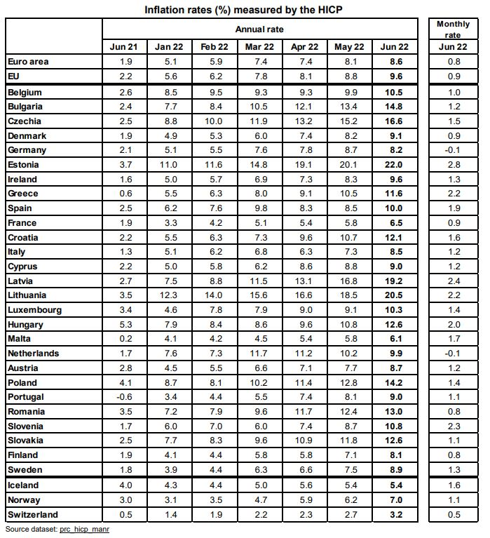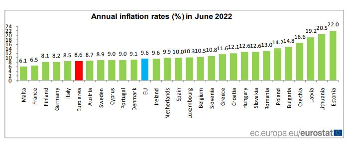 Τα χαμηλότερα ετήσια ποσοστά καταγράφηκαν στη Μάλτα (6,1%), στη Γαλλία (6,5%) και στη Φινλανδία (8,1%). Τα υψηλότερα ετήσια ποσοστά καταγράφηκαν στην Εσθονία (22,0%), στη Λιθουανία (20,5%) και στη Λετονία (19,2%). Σε σύγκριση με τον Μάιο, ο ετήσιος πληθωρισμός μειώθηκε σε δύο κράτη μέλη και αυξήθηκε σε είκοσι πέντε.