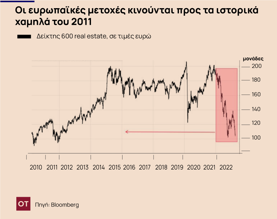 Tον κώδωνα του κινδύνου κρούουν οι αναλυτές για τις ευρωπαϊκές μετοχές ακινήτων, καθώς κινούνται προς τα ιστορικά χαμηλά του 2011, σύμφωνα με το Bloomberg.
