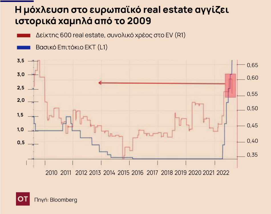 Ενώ ο τομέας των ακινήτων είναι συνήθως μοχλευμένος, το ποσοστό του χρέους στο κλάδο των ακινήτων εκτοξεύθηκε το περασμένο έτος, φθάνοντας περίπου το 60%, το υψηλότερο από το 2009. Με τα ποσοστά τώρα στο 3,5% στη ζώνη του ευρώ — σε σύγκριση με λιγότερο από 0,5% για το μεγαλύτερο μέρος της τελευταίας δεκαετίας — η αναχρηματοδότηση του χρέους θα μπορούσε να γίνει πιο δαπανηρή.